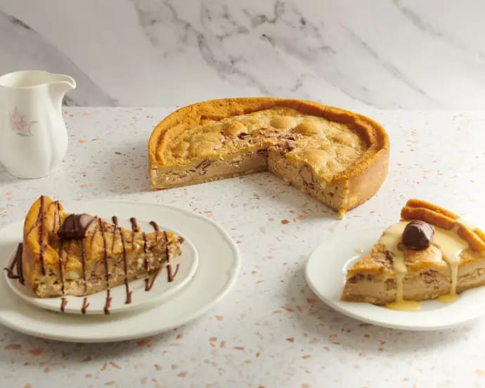 Kinder Cookie Pie is a rich, indulgent dessert featuring a soft, gooey cookie base filled with creamy Kinder chocolate, baked to perfection with a golden edge and a melt-in-the-middle centre—perfectly sweet, comforting, and irresistibly chocolatey in every bite
